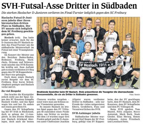 Das hatte keiner erwartet, doch für die D-Junioren des SV Haslach endete das Endturnier um die südbadische Meisterschaft im Futsal mit einer Traumplatzierung. Im Konzert der Meister aus den Bezirken Baden-Baden, Bodensee, Freiburg, Hochrhein, Ortenau und Schwarzwald mischte das SVH-Ensemble kräftig mit. Zum Auftakt gab es einen verdienten 2:0 Sieg gegen den SV 08 Kuppenheim, der Start war gelungen. Doch dann zeigte man zuviel Respekt vor dem SC Freiburg, eine kurze Schwächephase genügte und man verlor mit 0:5. Das brachte die Kinzigtäler jedoch nicht aus der Spur, gegen den SC Konstanz kämpfte man wieder und das Spiel wog hin und her, letztlich endete es mit einem gerechten 0:0. Gegen den SV Schopfheim lag man früh in Rückstand, doch es gelang diesen zum 1:1 auszugleichen. In den letzten Minuten war man drückend überlegen, doch auch die besten Chancen konnte man nicht mehr zum Sieg verwerten, sonst wäre man am Schluss sogar Vizemeister geworden. So musste man im letzten Spiel gegen den FC Villingen 08 zumindest einen Punkt holen, um Dritter zu werden. Mit dem 1:0 Sieg wurden sogar drei Punkte geholt und die D-Junioren unter Cheftrainer Joachim Allgaier waren verdienter Dritter in Südbaden, sehr zur Freude der vielen mitgereisten Eltern, Großeltern, Fans und Verantwortlichen des SVH.