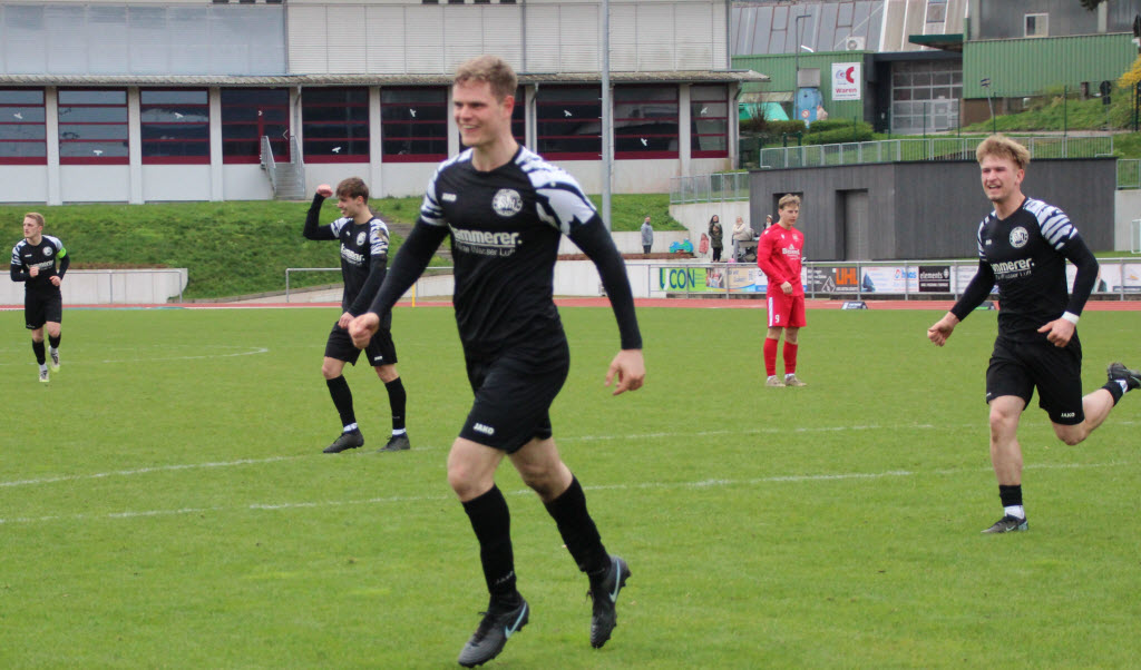 Freude pur beim Torschützen Luka Schmieder sowie Kevin Reis (li.) und Dean Hämmerle (re.) -
