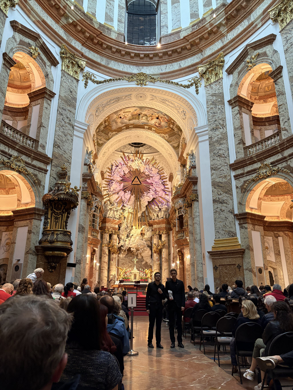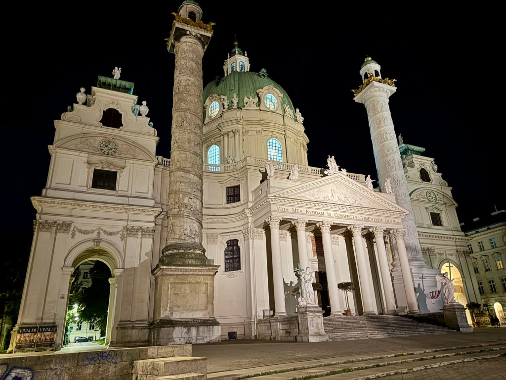 Doch damit war der Abend noch nicht zu Ende, denn ein weiteres Kultur-Highligt stand an, ein klassisches Streichkonzert mit den Vier Jahreszeiten von Vivaldi in der Wiener Karlskirche. Selbst für Nicht-Konzert-Liebhaber ein Augen- und Ohrenschmaus, der erste Geiger beeindruckte mit seiner Schnelligkeit am Bogen und den Tönen, die er damit erzeugte. Selbst der zweite Geiger Michael, der ansonsten nur auf ab und zu ertönende Pfiffe hörte, war erstaunt und mächtig begeistert. Ausklang fand der Abend bein einem Bierchen an der Hotelbar.