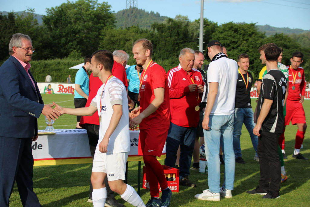 Im Anschluss wurde es dann etwas hektischer, doch Schiedsrichter Lukas Lindenmaier hatte die Begegnung jederzeit im Griff und leitete mit seinen Assistenten Marvin Maier und Arne Grigorowitsch sehr umsichtig. Fast hätte Joel Silzer noch erhöht, als Simon Lehmann auf der linken Seite abgedrängt wurde und zurücklegte, doch sein Schuss ging über die Latte. Es blieb aber spannend, der SVO bäumte sich nochmals auf und nach einer Flanke von Mika Braun an den langen Pfosten behinderten sich zwei Oberkirch Spieler gegenseitig. Fast wäre in der Nachspielzeit noch der Ausgleich gefallen, doch Torhüter Philipp Walter klärte nach einem Eckball, als er per Fußabwehr den Ball noch aus der rechten Ecke holte. Danach kannte der Jubel keine Grenzen mehr, der SV Haslach war Bezirkspokalsieger 2024 und durfte sich bei der anschließenden Siegerehrung feiern lassen.