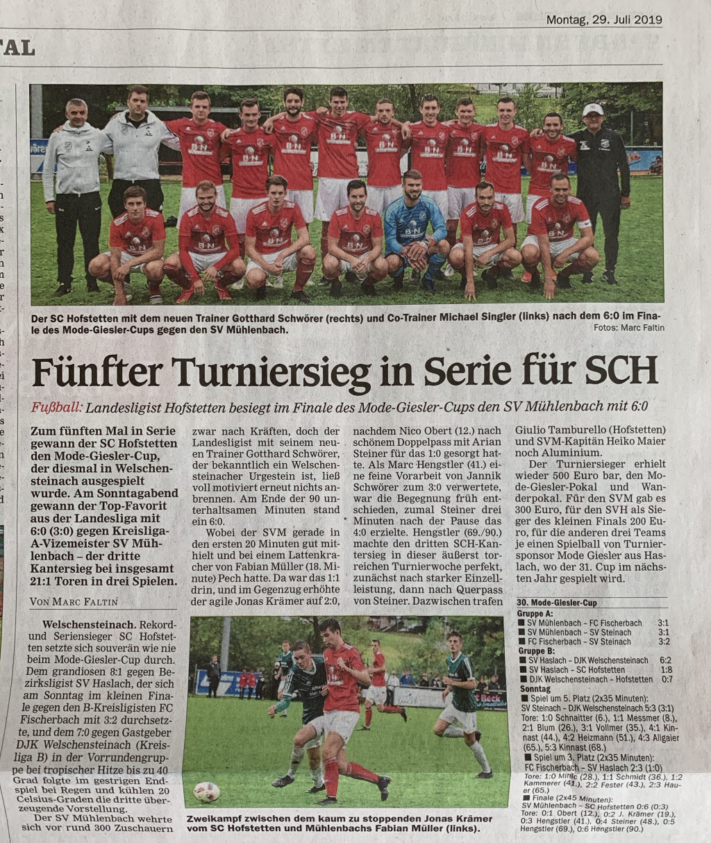 OT-Artikel vom 31.07.2019 Fünfter Turniersieg in Folge für den SC Hofstetten.