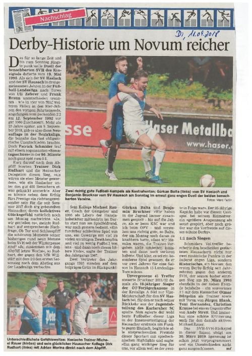 Es war am 19. Mai 1995, als sich beide Mannschaften in der Landesliga Staffel 1 in einem Punktspiel in Haslach gegenüberstanden und durch Tore von Uli Zeferer und Frank Braun 1:1 trennten, so wie auch im Hinspiel. 23 Jahre später gab es nun erstmals wieder ein Aufeinandertreffen in der Bezirksliga, also eine Etage tiefer. Doch der Reiz an dieser Begegnung war genauso groß wie damals, zahlreiche Zuschauer strömten ins Haslacher Stadion, doch sie bekamen über weite Strecken nicht den Fußball zu sehen, den man sich erhofft hatte.