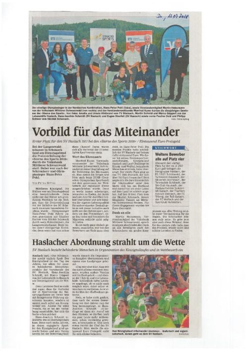 Beim diesjährigen Wettbewerb "Sterne des Sports" hat sich der SV Haslach mit dem Thema Kinzigtallauf - Zusammenarbeit mit Lebenshilfe und Club 82 sowie der Integration behinderter Menschen aber auch mit dem Thema Laufchallenge - Zusammenarbeit mit anderen Vereinen beworben.