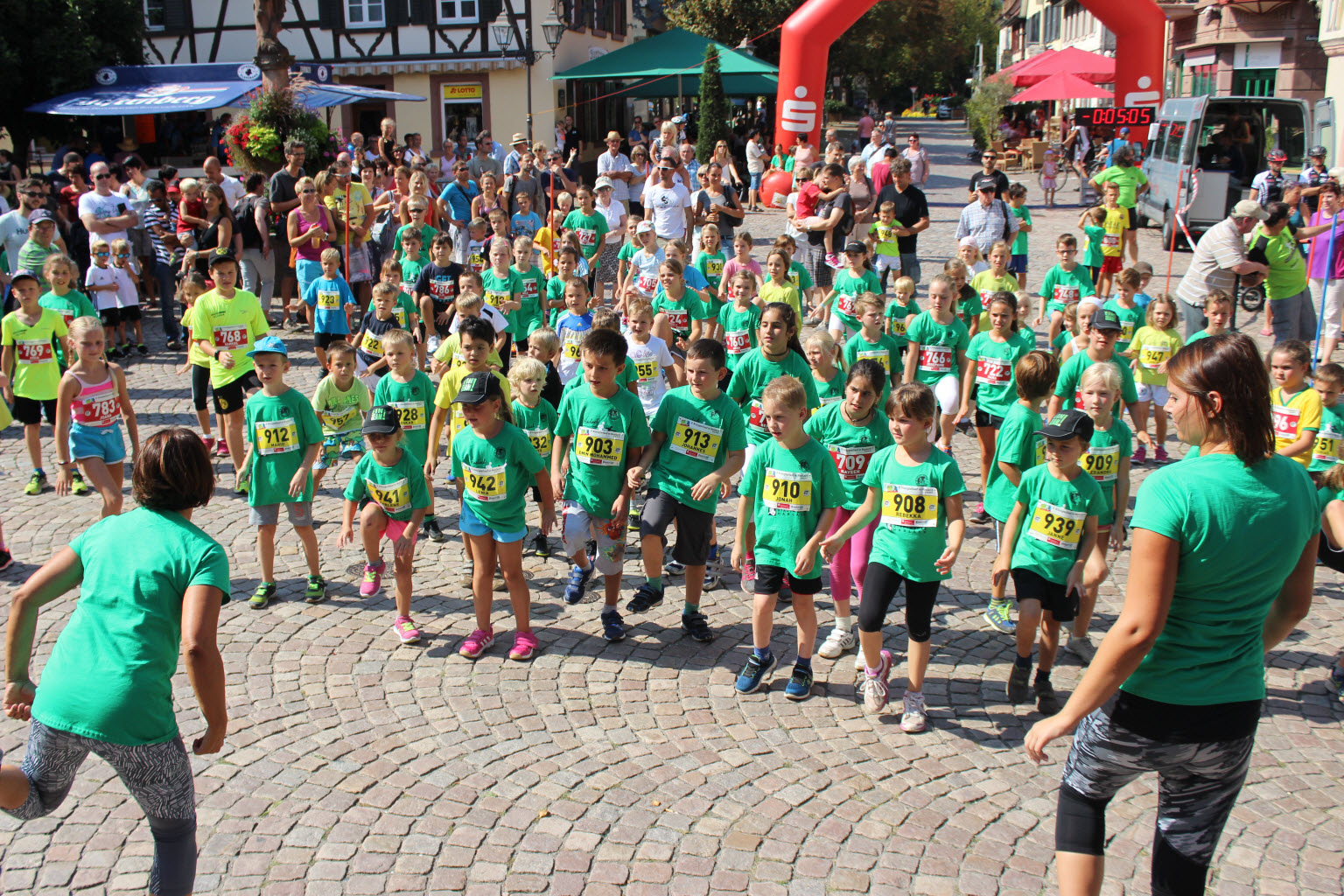 Gemeinsames Auflockern vor dem Lauf macht Spass, die Kids machen das vorbildlich -